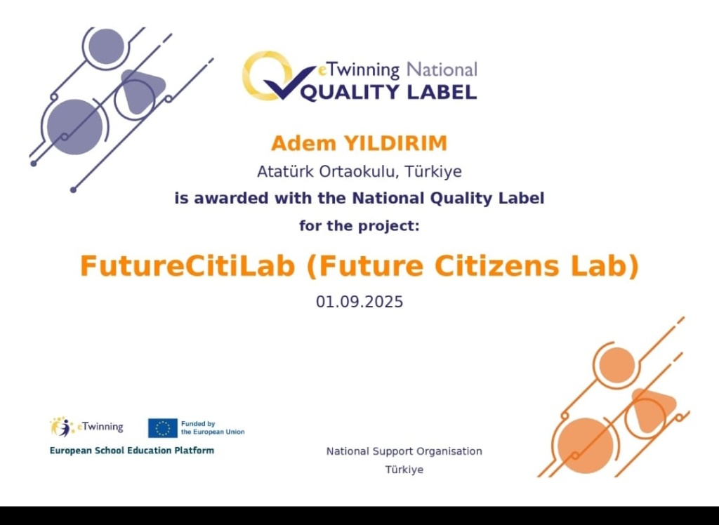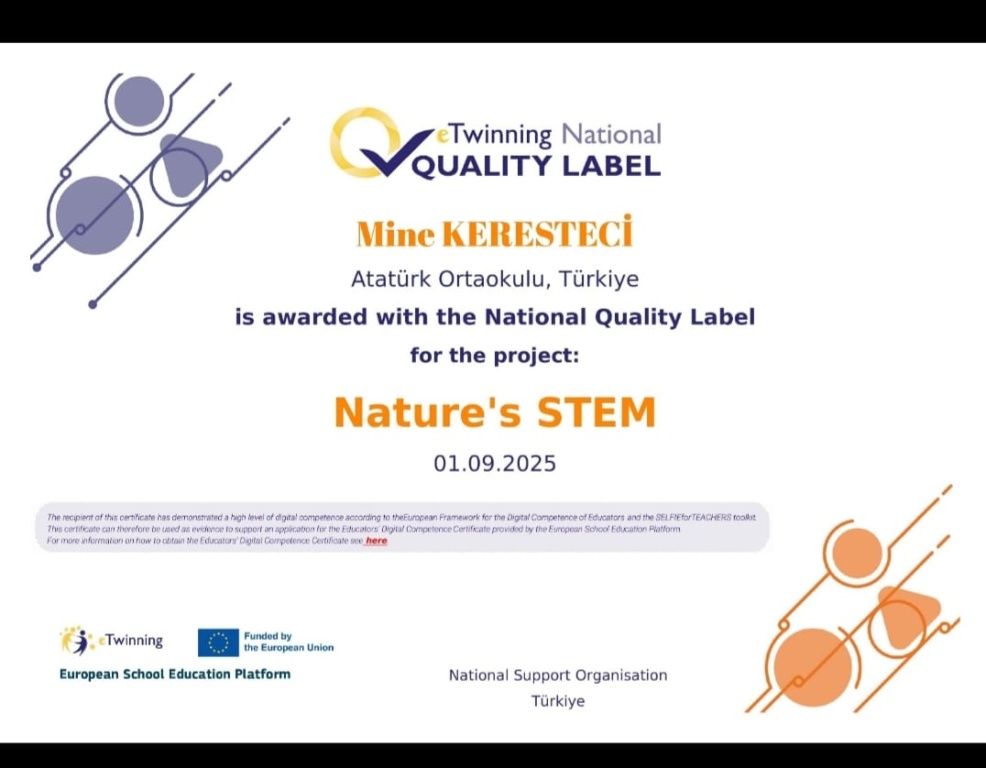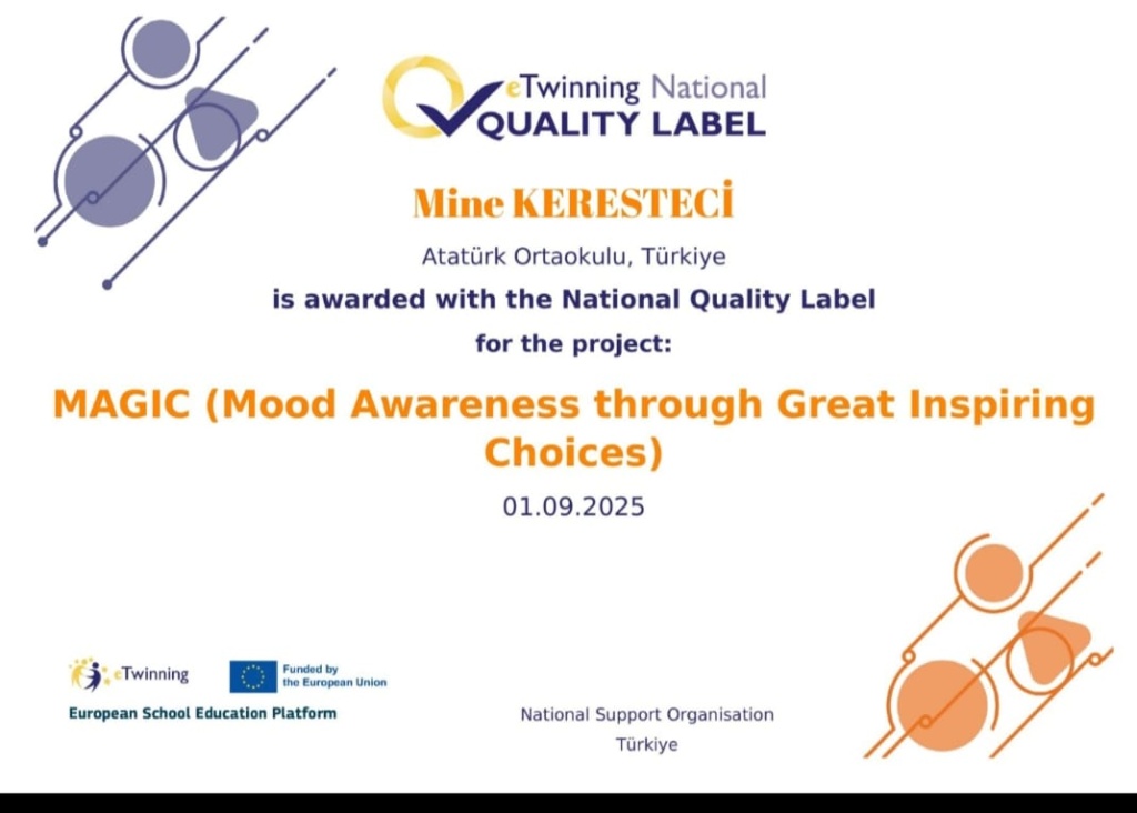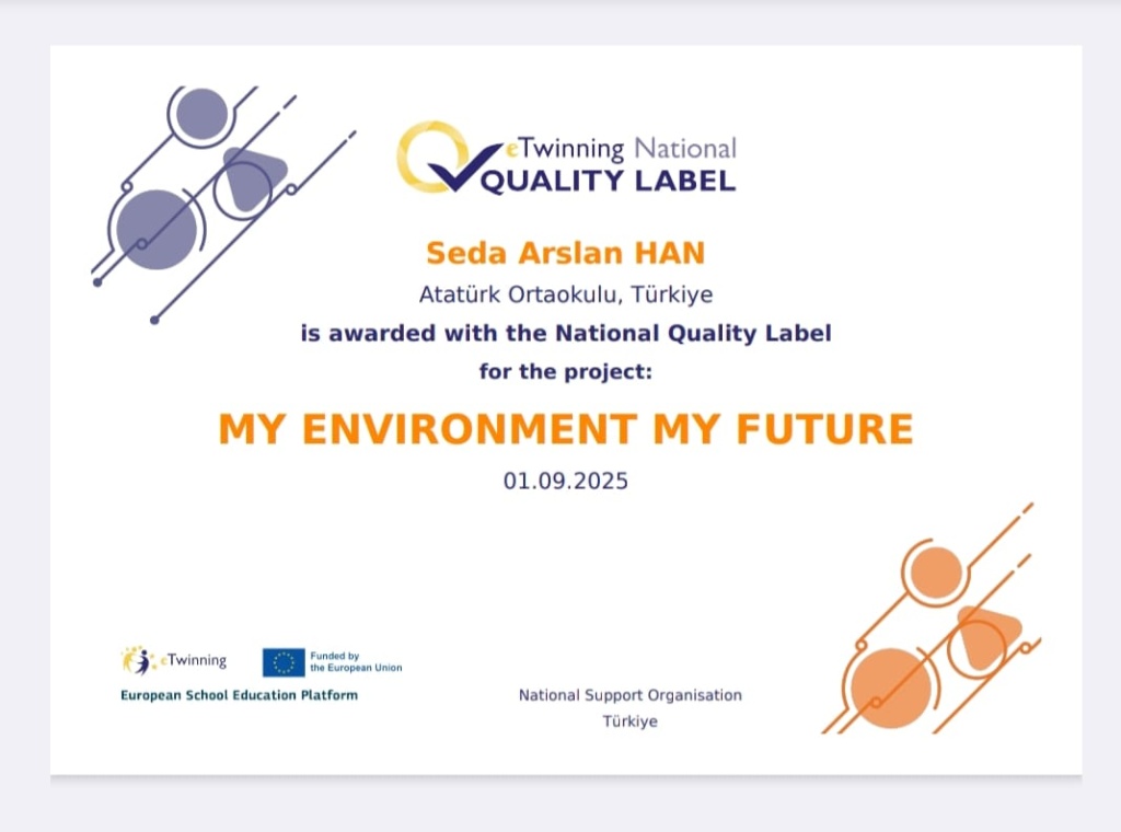 Okulumuz öğretmenleri Aynur Demir, Adem Yıldırım, Mine Keresteci ve Seda Arslanhan yürüttükleri e twinning projeleri ile Ulusal Kalite etiketini almaya hak kazandı, öğretmenlerimizi tebrik ediyoruz.